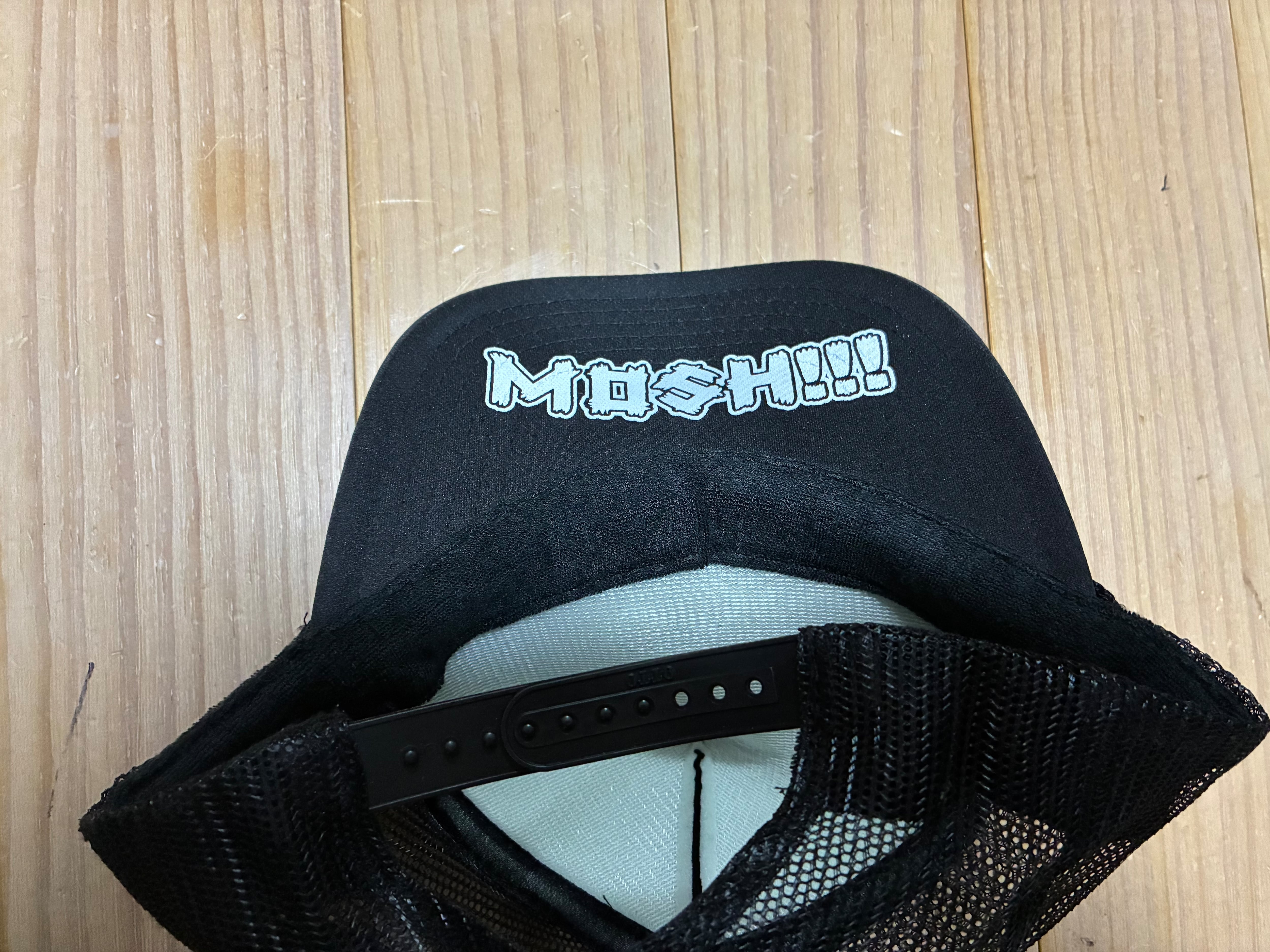 おデコ部分にロゴ、ツバ裏にMOSH!!!のプリント。